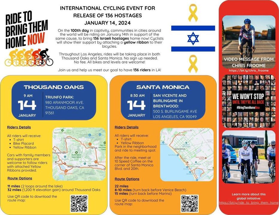 In Los Angeles, a Jewish/Israeli cycling club named Team Israel, led by 66-year-old Isaac Goren, swiftly initiated an ambitious operation with the objective of recruiting 136 riders to symbolize the 136 hostages. Within days, the small club received an overwhelming response, prompting the creation of an additional ride in Santa Monica and a planned helicopter flight carrying a “Bring Them Home” banner to fly above the riders.